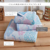 今治ブランドの高級品質、ソフトな触り心地。淡いパステルカラーの糸を3色組み合わせて花柄を表現。清涼感のあるデザインのタオルです。