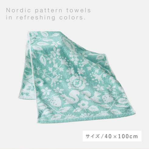 リスや鳥、草花や野いちごの絵柄を配置し、北欧の森をイメージしたデザイン。ブルーグリーンの爽やかなカラーのタオルです。