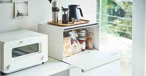 キッチンでゴチャゴチャしがちなパンやお菓子などがスッキリ片付く扉付きの収納ケース。 27Lの大容量。パンだけなら2斤が入ります。 他にも、紅茶や調味料、お菓子、シリアル、食品のストック、ミルクや離乳食、お薬など、いろんなものを扉で隠して収納。キッチンが気持ちよく片付きます。 扉付きはホコリからも食品を守ってくれます。 扉の開閉はマグネット式。強力マグネットなので勝手に空いてしまうこともありません。 ケースの上はトレーやマグなど普段使いのアイテムをまとめて置いてみても。 天板の耐荷重は約10kgなので、小型家電などを置くことができます。 上にトースターを置くと、デッドスペースも有効利用できます。ケースに入れたパンを取り出しすぐ焼いたりできるので忙しい朝の時短にも◎。 マットな質感で丈夫なスチール製。スチールなので磁石がくっつきメモなどを貼ることもできます。 シンプルデザインなのでキッチンのインテリアにも馴染みます。 ブラックとホワイトからお選びいただけます。 こちらのシリーズは、別売りで幅62.2cmのワイドサイズとスリムな縦型もございます。 カテゴリ : インテリア > インテリア収納 > キッチン > ブレッドケース 送料 : 無料 ラッピング : 不可 出荷元 : メーカー直送 商品詳細 サイズ:幅40×奥行34.5×高さ24cm 材質:本体/スチール(粉体塗装)、マグネット、緩衝材/シリコーン 重量:5.1kg 原産国:中国 耐荷重:10kg シリーズ名:タワー(山崎実業) メーカー品番:4352,4353 ITEM 商品名:ブレッドケース...