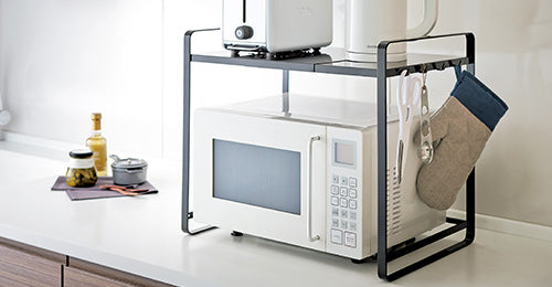 レンジ上のデッドスペースを有効活用。幅が調整できる伸縮レンジラック。 お持ちのレンジの幅に合わせて、約47.5〜75cmまで伸縮可能。 高さ約43cmと十分にあるので大きめのレンジやオーブントースターが収納できます。レンジ上にはコーヒーメーカーや電気ポットもまとめて収納。キッチンがすっきりと片付きます。 ラックの横に4つのフックが付いていて、キッチンバサミや鍋つかみ、輪ゴムなどが引っ掛けられます。フックは組み立て時にどちらの側面に設置するか選べるので、置き場所に合わせてつけることができます。 縮めたままで使用しても、引き延ばして使用しても安定感がありしっかりとした作り。組立も簡単です。 レンジ周りの使用はもちろん、リビングやパソコン周りで上にプリンタを置いて使用しても◎。 カラーはスタイリッシュなブラックとホワイトからお選びいただけます。 カテゴリ : インテリア > インテリア収納 > キッチン > キッチンラック 送料 : 無料 ラッピング : 不可 出荷元 : メーカー直送 商品詳細 サイズ:本体/幅47.5-75×奥行35×高さ50cm、収納内寸/幅44-71×奥行33×高さ43.5cm(伸縮可能範囲27cm) 重量:4.6kg 材質:スチール(粉体塗装) 原産国:中国 耐荷重:棚12kg、各フック/500g 備考:組立式 シリーズ名:タワー(山崎実業) メーカー品番:3130,3131 ITEM 商品名:レンジ上 ラック レンジラック おしゃれ 電子レンジラック...